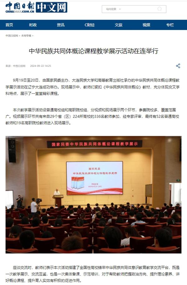 9月19日至20日,由国家民委主办,大连民族大学和高等教育出版社承办的中华民族共同体概论课程教学展示活动在辽宁大连成功举办。现场展示中,教师们紧扣《中华民族共同体概论》教材,充分体现交叉学科特点,展示了一堂堂精彩课程。