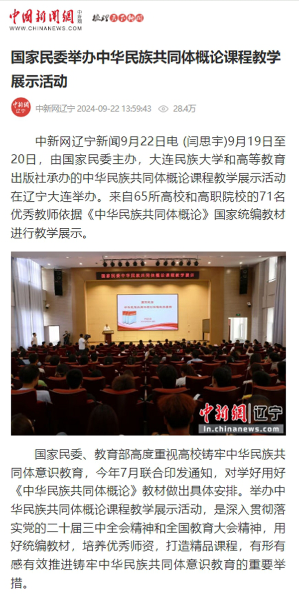 中新网辽宁新闻9月22日电 (闫思宇) 9月19日至20日,由国家民委主办,大连民族大学和高等教育出版社承办的中华民族共同体概论课程教学展示活动在辽宁大连举办。来自65所高校和高职院校的71名优秀教师依据《中华民族共同体概论》国家统编教材进行教学展示。