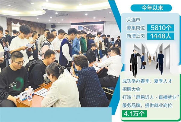 截至目前,大连高校毕业生等青年群体就业取得阶段性成果。大连市人力资源和社会保障局局长戴紫童介绍,大连深入实施青年就业见习计划,今年以来,募集岗位5810个,新增上岗1448人;成功举办春季、夏季人才招聘大会,打造“屏易近人·直播就业”服务品牌,提供就业岗位4.1万个。