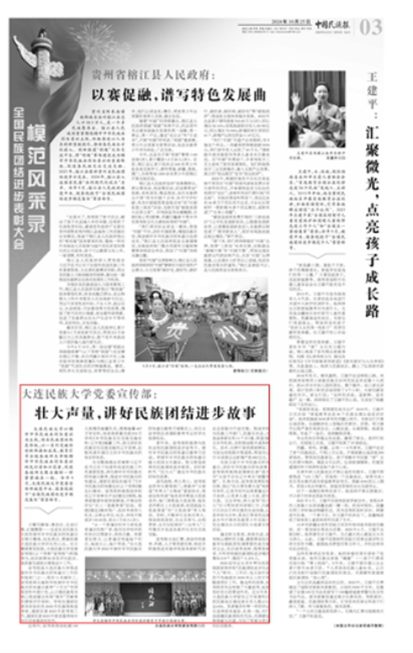 大连民族大学以铸牢中华民族共同体意识为主线,传承民族团结优良传统,以一系列突破性创新举措和成果,教育引导全校各族师生争做铸牢中华民族共同体意识的先行者和示范者,促进各族师生像石榴籽一样紧紧抱在一起。今年9月,大连民族大学党委宣传部被党中央、国务院授予“全国民族团结进步模范集体”荣誉称号。
