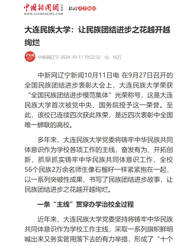 多年来,大连民族大学党委将铸牢中华民族共同体意识作为学校各项工作的主线,奋发有为、开拓创新,抓早抓实铸牢中华民族共同体意识工作,全校56个民族2万余名师生像石榴籽一样紧紧抱在一起,以一系列突破性成果,书写了民族团结进步故事,让民族团结进步之花越开越绚烂。