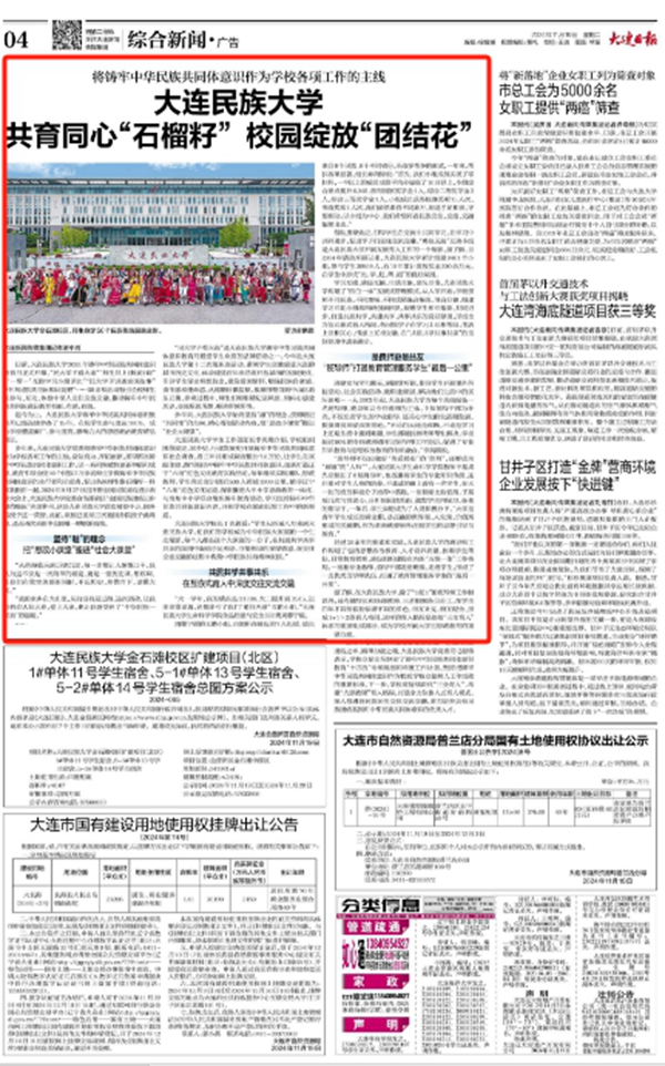 多年来,大连民族大学党委将铸牢中华民族共同体意识作为学校各项工作的主线。奋发有为、开拓创新,抓早抓实铸牢中华民族共同体意识工作,以一系列突破性创新举措和成果,教育引导全校56个民族2万余名师生争做铸牢中华民族共同体意识的先行者和示范者,促进各族师生像石榴籽一样紧紧抱在一起。2024年9月27日召开的全国民族团结进步表彰大会上,大连民族大学党委宣传部荣获“全国民族团结进步模范集体”光荣称号,这是大连民族大学首次被党中央、国务院授予这一荣誉。此前,该校已连续三次被国务院授予此殊荣,是近四次表彰中全国唯一蝉联的高校。
