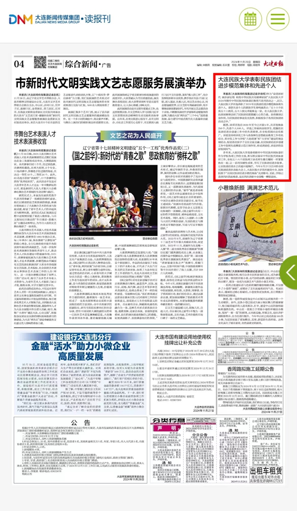 本报讯(大连新闻传媒集团记者许晓楠) 作为“奋进新时代 阔步新征程 构筑中华民族共有精神家园”大连民族大学2024年铸牢中华民族共同体意识教育月系列活动之一,近日,大连民族大学评选表彰了2024年民族团结进步模范集体和先进个人。荣获先进个人的满族学生周鸣涵表示:“五十六个民族五十六枝花,五十六族兄弟姐妹是一家。在大连民族大学,我深刻地领会到了民族团结那震撼人心的力量。我将继续以身作则,为民族团结事业发光发热,积极投身于各类民族团结活动之中。”