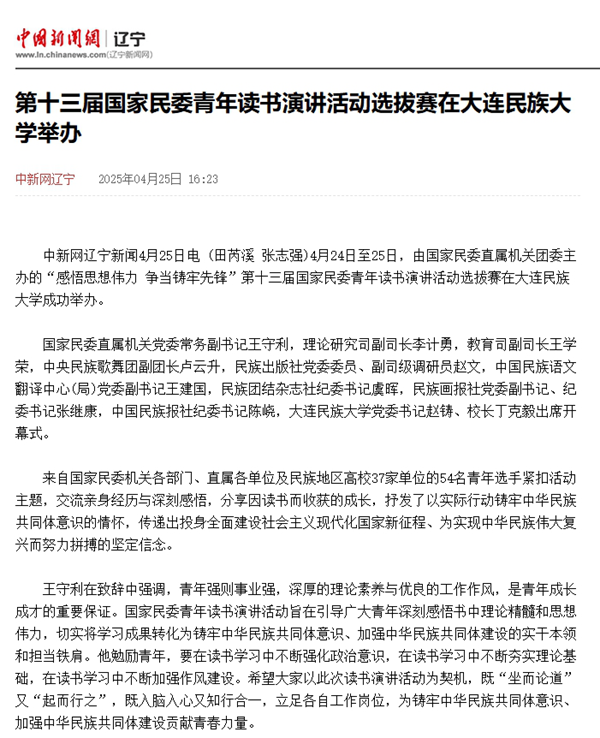 中新网辽宁新闻4月25日电 (田芮溪 张志强) 4月24日至25日,由国家民委直属机关团委主办的“感悟思想伟力 争当铸牢先锋”第十三届国家民委青年读书演讲活动选拔赛在大连民族大学成功举办。