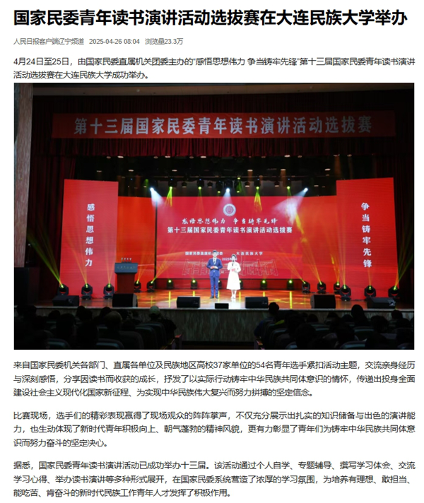 4月24日至25日,由国家民委直属机关团委主办的“感悟思想伟力 争当铸牢先锋”第十三届国家民委青年读书演讲活动选拔赛在大连民族大学成功举办。