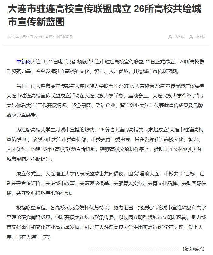 为汇聚高校大学生对城市宣推的热忱,26所驻大连的高校共同发起成立“大连市驻连高校宣传联盟”。该联盟由大连市委宣传部、市委教育工委指导,旨在发挥驻连高校文化、智力、人才优势,构建“城市+高校”联动宣传机制,建强高校交流协作平台,推动大连文化软实力和城市影响力不断提升。