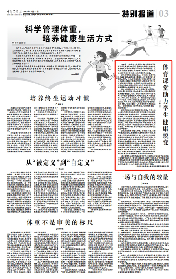 2020年,大连民族大学启动实施《本科生体育教育教学改革方案(试行)》,创新性地将超重学生体重管理纳入体育课授课内容与成绩考核单列项目。这几年,历经理论建构、实践探索、集体研讨与持续改进,逐步形成有爱、有感、有效的健康育人之道。