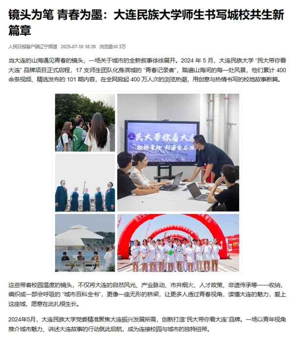 当大连的山海遇见青春的镜头,一场关于城市的全新叙事徐徐展开。2024 年 5 月,大连民族大学 “民大带你看大连” 品牌项目正式启程,17 支师生团队化身滨城的 “青春记录者”,踏遍山海间的每一处风景,他们累计 400 余条视频、精选发布的 101 期内容,在全网掀起 400 万人次的浏览热潮,用创意与热情书写的校地故事新篇。