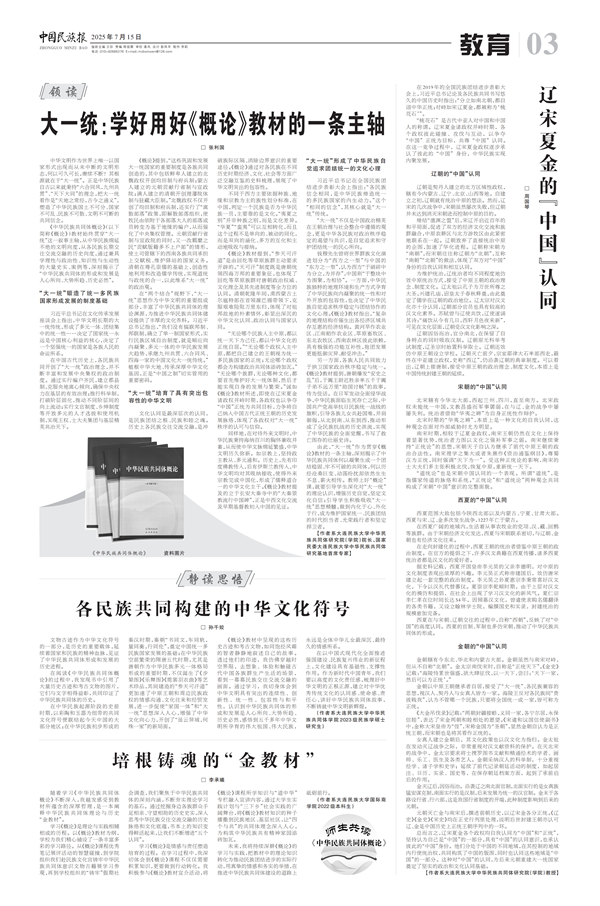 7月15日,《中国民族报》教育版整版报道我校师生共读《中华民族共同体概论》,内容包括张利国教授的《大一统:学好用好〈概论〉教材的一条主轴》,周国琴教授的《辽宋夏金的“中国”认同》,以及中华民族共同体学院研究生孙千姣的《各民族共同构建的中华文化符号》和国际商学院本科生李承曦的《培根铸魂的“金教材”》。