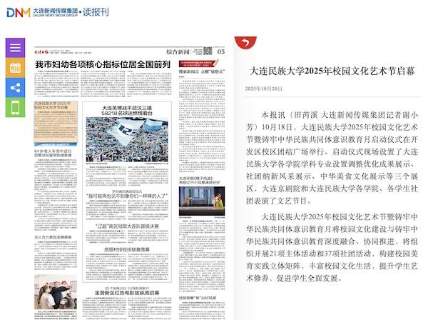 本报讯(田芮溪 大连新闻传媒集团记者谢小芳)10月18日,大连民族大学2025年校园文化艺术节暨铸牢中华民族共同体意识教育月启动仪式在开发区校区团结广场举行。启动仪式现场设置了大连民族大学各学院学科专业设置调整优化成果展示、社团纳新风采展示、中华美食文化展示等三个展区,大连京剧院和大连民族大学各学院、各学生社团表演了文艺节目。