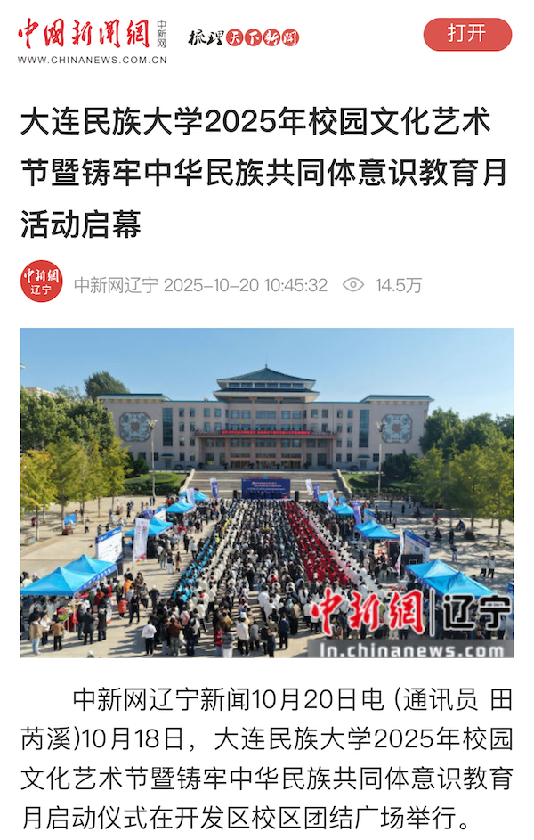 中新网辽宁新闻10月20日电 10月18日,大连民族大学2025年校园文化艺术节暨铸牢中华民族共同体意识教育月启动仪式在开发区校区团结广场举行。
