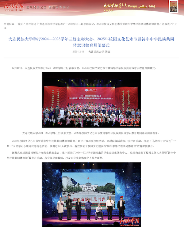 12月10日,大连民族大学举行2024—2025学年三好表彰大会、2025年校园文化艺术节暨铸牢中华民族共同体意识教育月闭幕式。