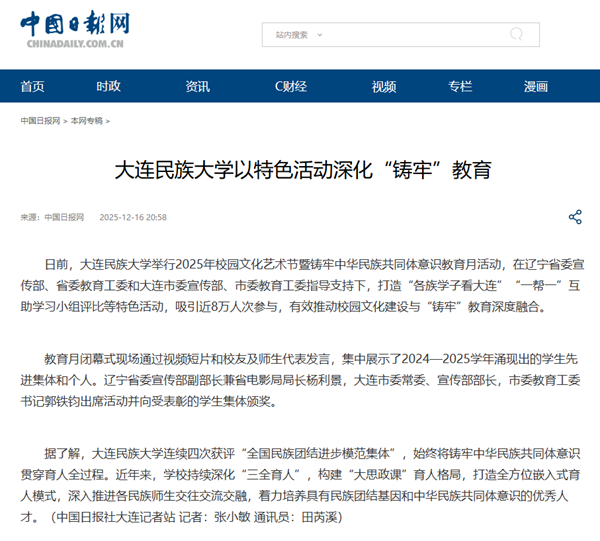 据了解,大连民族大学连续四次获评“全国民族团结进步模范集体”,始终将铸牢中华民族共同体意识贯穿育人全过程。近年来,学校持续深化“三全育人”,构建“大思政课”育人格局,打造全方位嵌入式育人模式,深入推进各民族师生交往交流交融,着力培养具有民族团结基因和中华民族共同体意识的优秀人才。(中国日报社大连记者站 记者:张小敏)