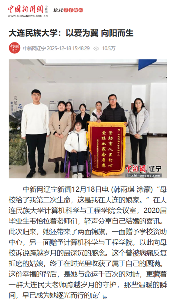 中新网辽宁新闻12月18日电 (韩雨琪 涂豪) “母校给了我第二次生命,这是我在大连的娘家。”在大连民族大学计算机科学与工程学院会议室,2020届毕业生韦怡拉着老师们,轻声分享自己结婚的喜讯。此次归来,她还带来了两面锦旗,一面赠予学校资助中心,另一面赠予计算机科学与工程学院,以此向母校诉说跨越岁月的最深沉的感念。这个曾被病痛反复折磨的姑娘,终于在时光里收获了属于自己的圆满。这份幸福的背后,是她与命运千百次的对峙,更藏着一群大连民大老师跨越岁月的守护,那些温暖的瞬间,早已成为她逐光而行的底气。