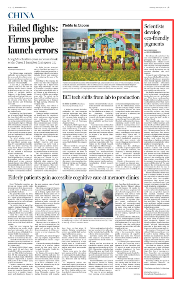 1月19日,《中国日报》(China Daily)英文版报道我校董斌教授团队立足我国稀土资源优势,突破传统颜料局限,成功研发出全新一代环保颜料。面对“传统无机颜料虽然色彩稳定,却因重金属添加而存在健康风险隐患”的难题,团队选择“宽带隙基质+稀土掺杂”的技术路线,经过上千次有针对性的实验,通过精准调控稀土离子的光学行为,实现绿、黄、橙、红四大色系的高饱和度呈色,且具备耐高温、抗老化、色牢度强等性能。目前,团队已与大连金普新区达成初步合作意向,通过校地合作建立500吨级试验生产线实现量产,并计划从建筑外墙、跑道、陶瓷、汽车涂料等与民生密切相关的领域切入,让“无毒替代”走进普通消费品领域。