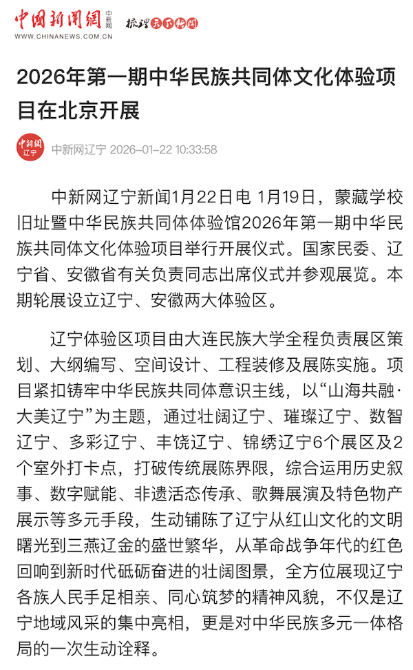 中新网辽宁新闻1月22日电 1月19日,蒙藏学校旧址暨中华民族共同体体验馆2026年第一期中华民族共同体文化体验项目举行开展仪式。国家民委、辽宁省、安徽省有关负责同志出席仪式并参观展览。本期轮展设立辽宁、安徽两大体验区。