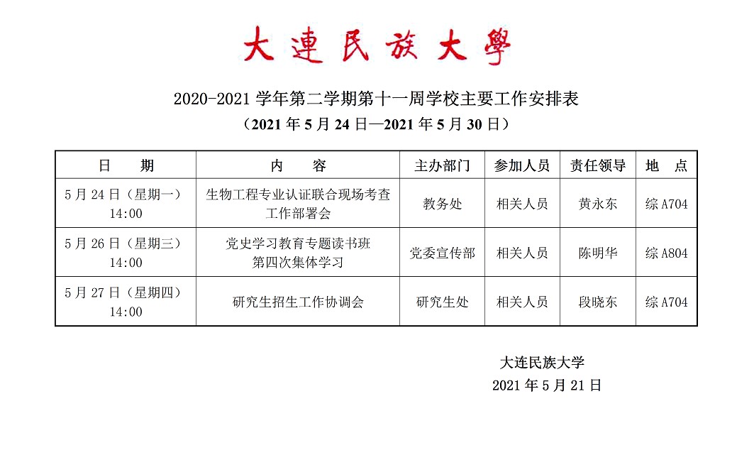 2020-2021学年第二学期第十一周学校主要工作安排表