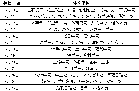 4.大连市体检中心开发区分部(海边体检中心)专场体检时间是5月10日--26日,各部门具体体检时间见下表。不参加专场体检的教职工可于5月6日--6月30日自行预约体检,咨询电话:88019808,体检报告学校统一领取。