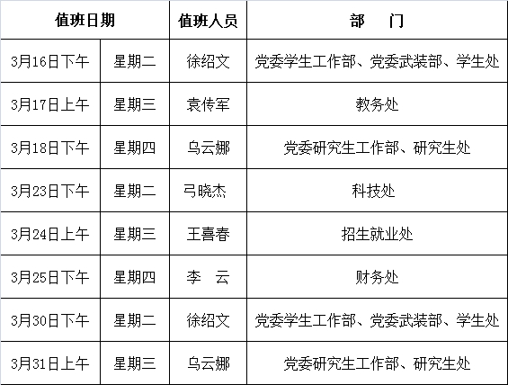 2021年3月份相关职能部门负责人金石滩校区值班安排表