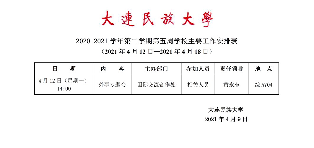 2020-2021学年第二学期第五周学校主要工作安排表