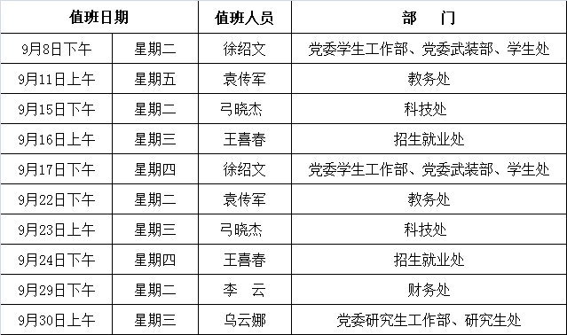 2020年9月份相关职能部门负责人金石滩校区值班表