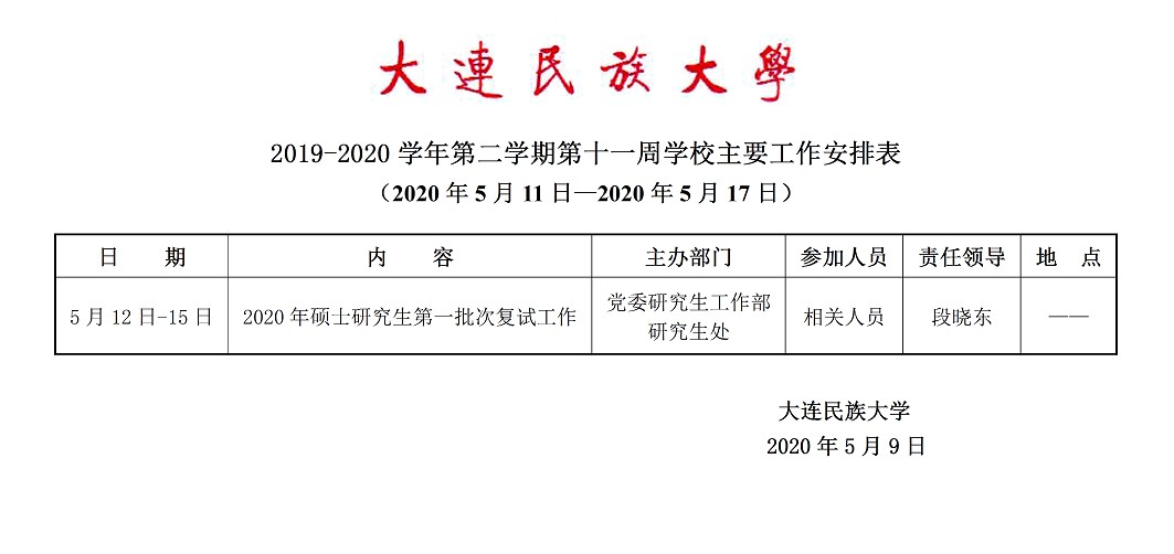 2019-2020学年第二学期第十一周学校主要工作安排表