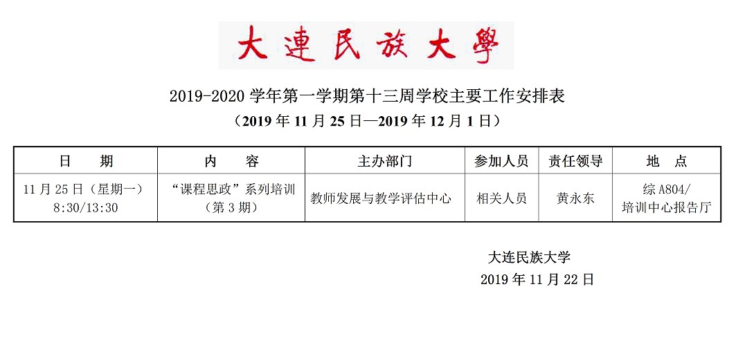 2019-2020学年第一学期第十三周学校主要工作安排表
