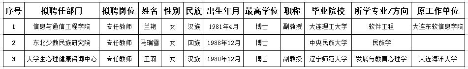 根据《国家民委直属事业单位公开招聘人员暂行办法》《大连民族大学优秀人才引进与管理实施办法(试行)》及《大连民族大学2019年公开招聘教师公告》,经个人申报、资格审查、试讲考核、体检考察等程序,经学校党委研究,确定了大连民族大学2019年公开招聘拟聘人选兰艳等3人,现予以公示。