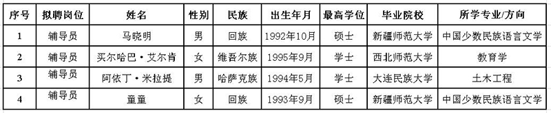 根据《国家民委直属事业单位公开招聘人员暂行办法》及《大连民族大学2019年公开招聘少数民族专职辅导员公告》,经个人申报、资格审查、笔试面试、体检考察、审查外调等程序,经学校党委研究,确定了大连民族大学2019年公开招聘辅导员拟聘人选马晓明等4人,现予以公示。