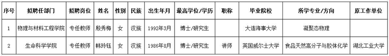 根据《国家民委直属事业单位公开招聘人员暂行办法》《大连民族大学优秀人才引进与管理实施办法(试行)》及《大连民族大学2019年公开招聘教师公告》,经个人申报、资格审查、试讲考核、体检考察、查阅干部档案等程序,经学校党委研究,确定了大连民族大学2019年公开招聘拟聘人选殷秀梅等2人,现予以公示。