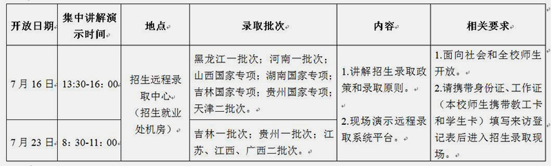 为认真贯彻教育部关于深入实施高校招生阳光工程,落实招生信息“十公开”要求,使广大师生了解招生录取工作流程及录取办法,增加招生录取工作透明度,经学校本科生、预科生招生工作领导小组研究决定,在录取期间进行两次开放日活动,具体安排如下: