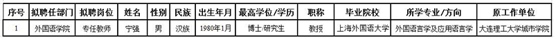 根据《大连民族大学优秀人才引进与管理实施办法(试行)》及《大连民族大学2019年公开招聘高层次人才公告》,经个人申报、资格审查、试讲考核、体检考察、查阅干部档案等程序,经学校党委研究,确定了大连民族大学2019年公开招聘高层次人才宁强1人,现予以公示。