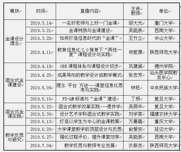 本次直播课程主题:打造“金课”,共分为四个模块:“金课”设计理念、混合式“金课”建设、混合式“金课”实践、教学反思与研究。本次培训课程来自全国各地的教育领域先行者与实践者,将带来最新的前沿研究实践成果,与教师交流、共享。直播中,主讲专家将在线解答学员的重点问题,解决老师们的实际应用问题。