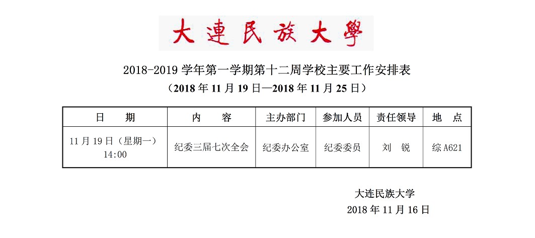 2018-2019学年第一学期第十二周学校主要工作安排表