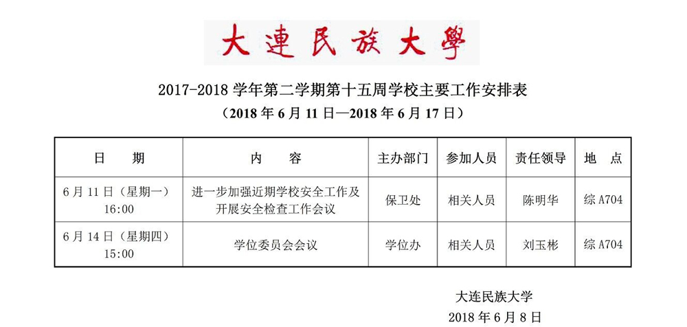 2017-2018学年第二学期第十五周学校主要工作安排表
