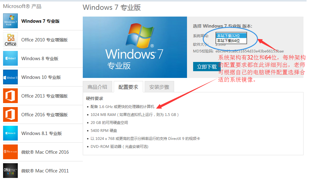 平台提供Windows系统(Win7专业版、Win8专业版、Win8.1专业版、Win10专业版)及Office软件(Office 2010专业增强版、Office 2013专业增强版、Office 2016专业增强版和Office:Mac 2011、Office:Mac 2016正式版)的镜像下载。根据个人电脑的硬件配置情况选择适合的镜像安装。每种镜像具体的配置要求和安装步骤在镜像的下载页面都可看到。