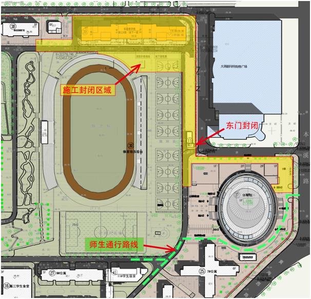 封闭管理期间,学校东门禁止通行,体育馆东侧大门分南北两侧通行,北侧为施工车辆通行,南侧为行人通行。