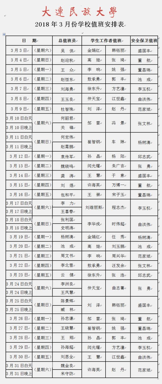 2018年3月份学校值班安排表