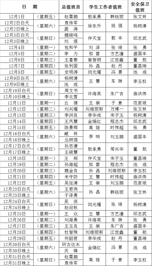 2017年12月份学校值班安排表