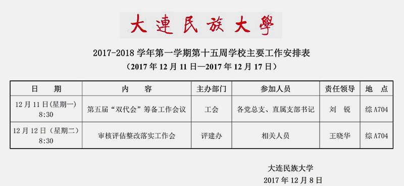 2017-2018学年第一学期第十五周学校主要工作安排表