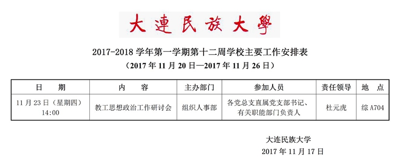 2017-2018学年第一学期第十二周学校主要工作安排表