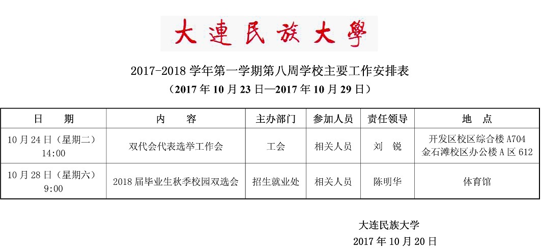 2017-2018学年第一学期第八周学校主要工作安排表
