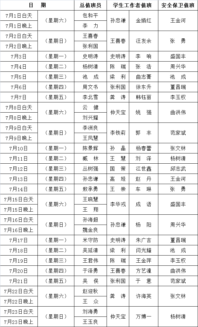2017年7月份学校值班安排表