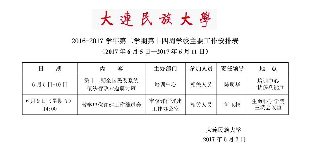 2016-2017学年第二学期第十四周学校主要工作安排表