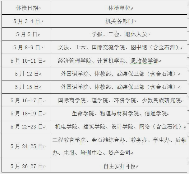 2、大连体检中心检查时间:5月3日-5月27日(每天上午7:40—9:30),各单位体检日期安排见附表。