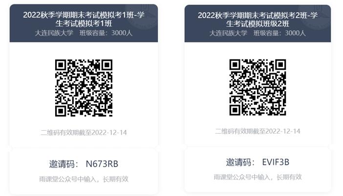 3.参与方式:学生雨课堂身份绑定好后,扫描下方二维码(二选一),完成入班,通过雨课堂微信公众号进入“我听的课程”可以查看 “2022秋季学期期末考试模拟考”,在模拟考试开启时间段,点击“2022-2023-1期末考试-模拟考(考试测试)”,开始模拟考。模拟考试开启时,已入班同学雨课堂微信公众号也会同步接收到考试通知,点击通知链接可直接进入模拟考试。
