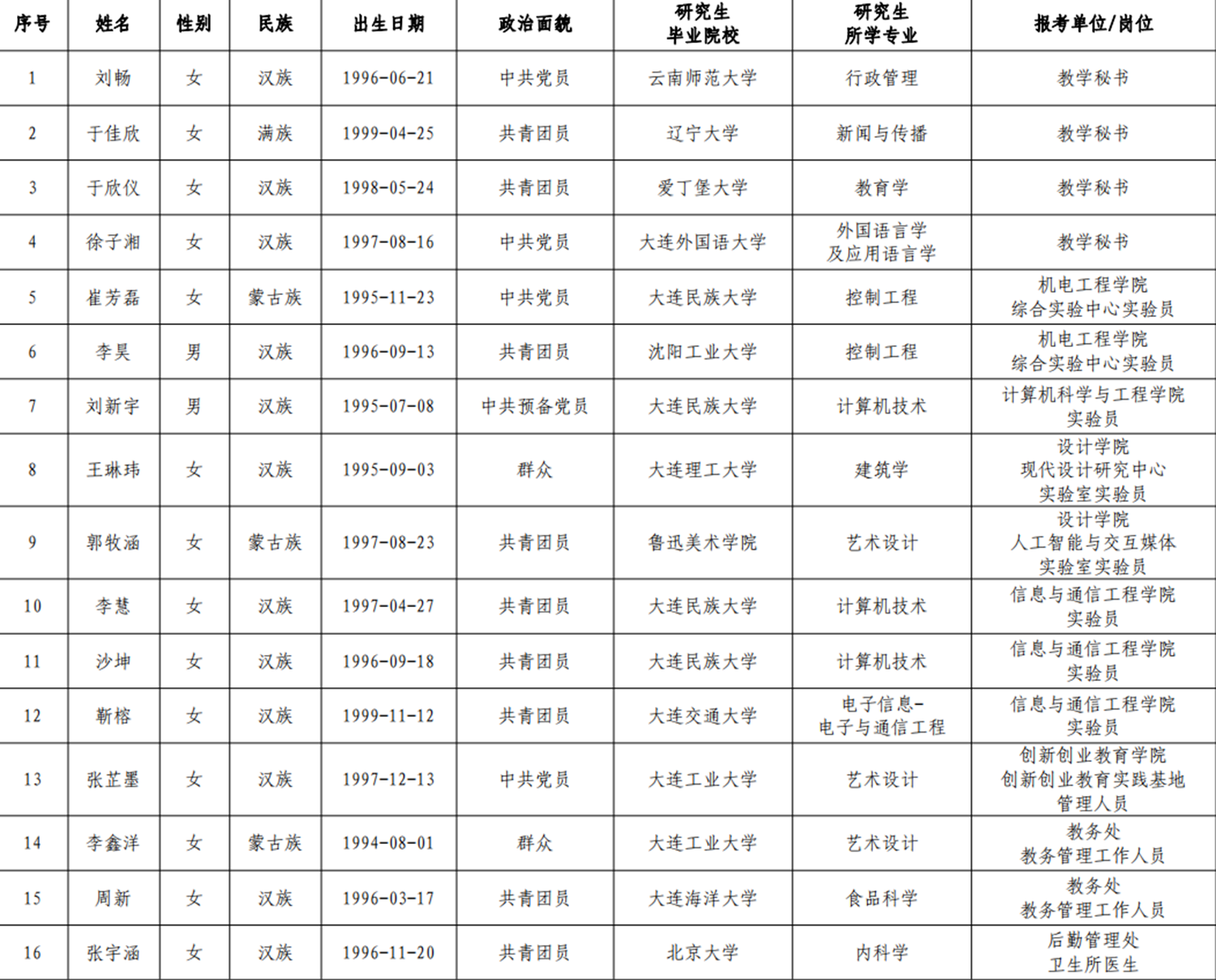 根据《大连民族大学2024年春季学期公开招聘劳动合同制人员公告》,通过个人报名、资格审查、笔试、面试等环节,经校长办公会研究,现将拟聘用人员公示如下: