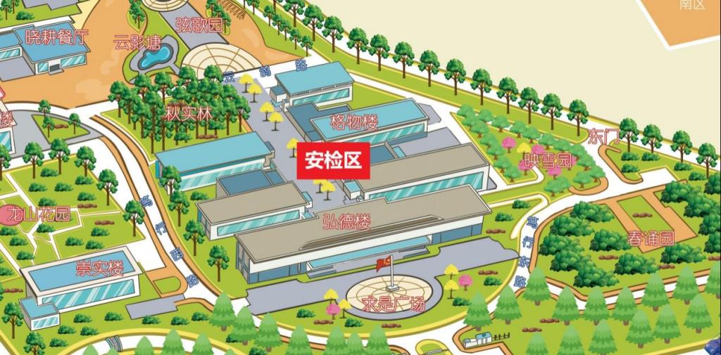 开发区校区考点在太阳鸟报告厅进行安检,由太阳鸟报告厅东南门(面向网球场一侧)进入报告厅(缓冲区)候场,由报告厅西门(面向融汇楼一侧)离开,按指定路线进入融汇楼各考场。