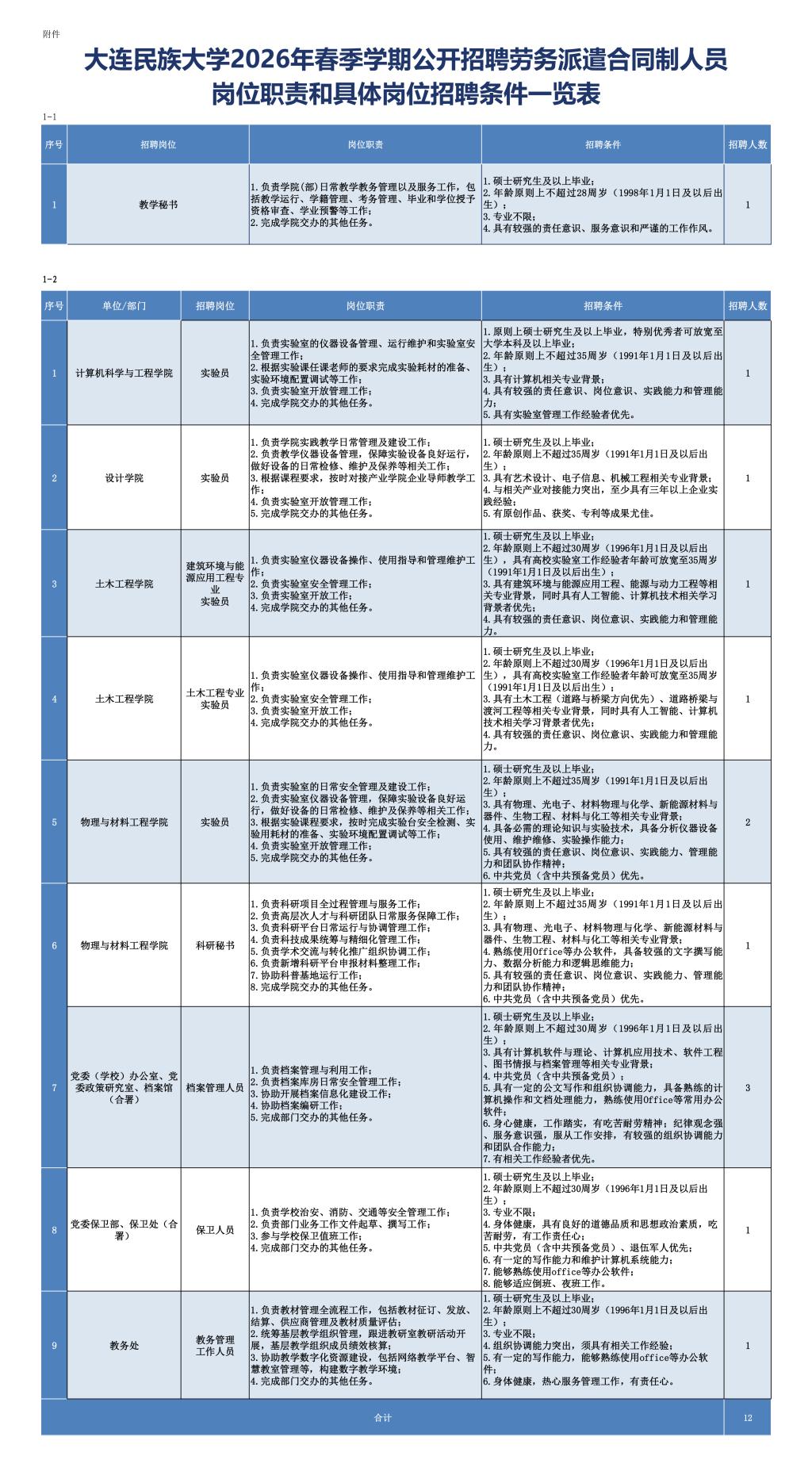 详见《大连民族大学2026年春季学期公开招聘劳务派遣合同制人员岗位职责和具体岗位招聘条件一览表》(附件1)。