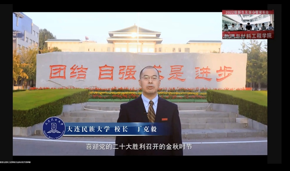 首先,校长丁克毅同志代表学校向全体新生及父母致以诚挚的问候,并向家长们全方位介绍了大连民族大学,他指出作为唯一建在东北和沿海开放地区的民族学校,先后在2009年、2014年和2019年三次被国务院授予全国民族团结进步模范集体。作为民大学子,我们要把民族团结基因植入牢记,我们每个人都是中华民族的一员,要从内心深处树立起中华民族共同体意识。随后丁克毅校长介绍大连民族大学有9个国家级、27个省级一流专业,超过一半的本科专业进入了一流行业,有包括4名国家级人才在内的1200多名教职工,其中600余人担任班导师。同时,校长也向新生提出了殷切期望,希望2022级新生认真对待每一节课和每一个活动,更快融入新的集体,融入民大。